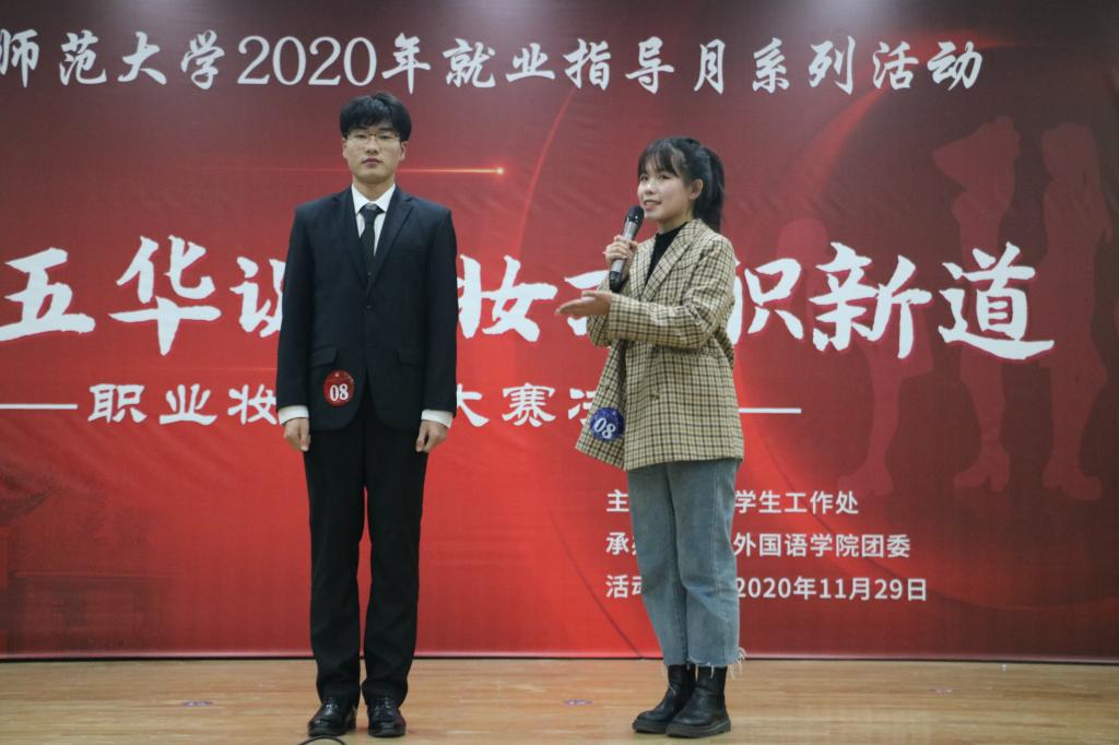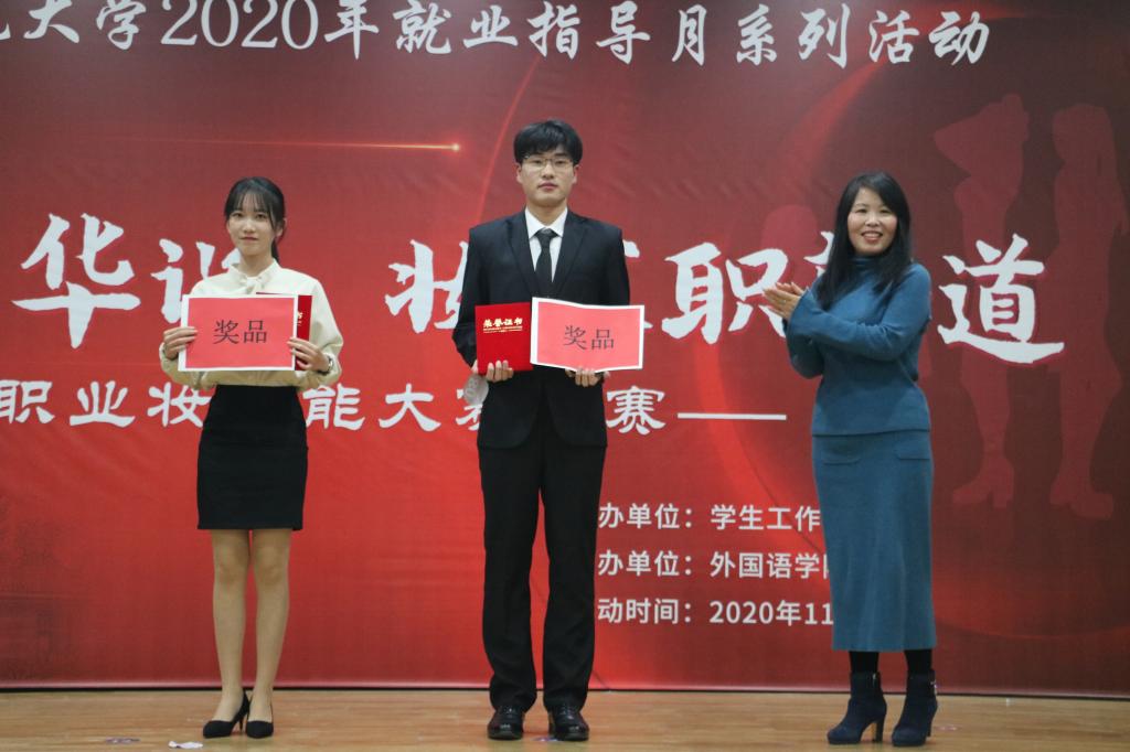 选手王德龙以符合专业特色的职业定位和精彩的现场表现,给观众们留下了深刻印象;教育学院选手张睿迪妆容清爽,身着职业套裙,尽显大方干练,模拟空姐职业,赢得了评委们的好评。最终,王德龙、王智毅两组选手获得一等奖,程佳雨、张睿迪等三组选手获得二等奖,李雅文、于淑萍等六组选手获得三等奖。