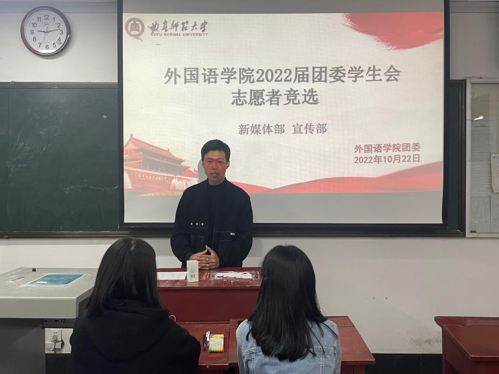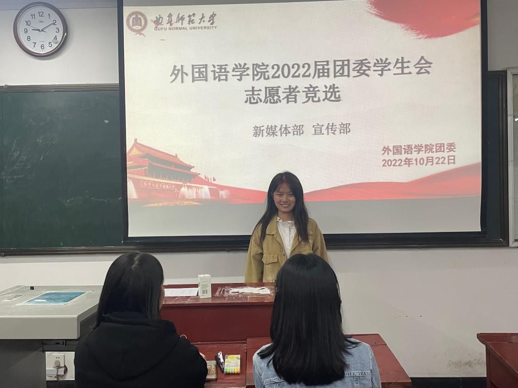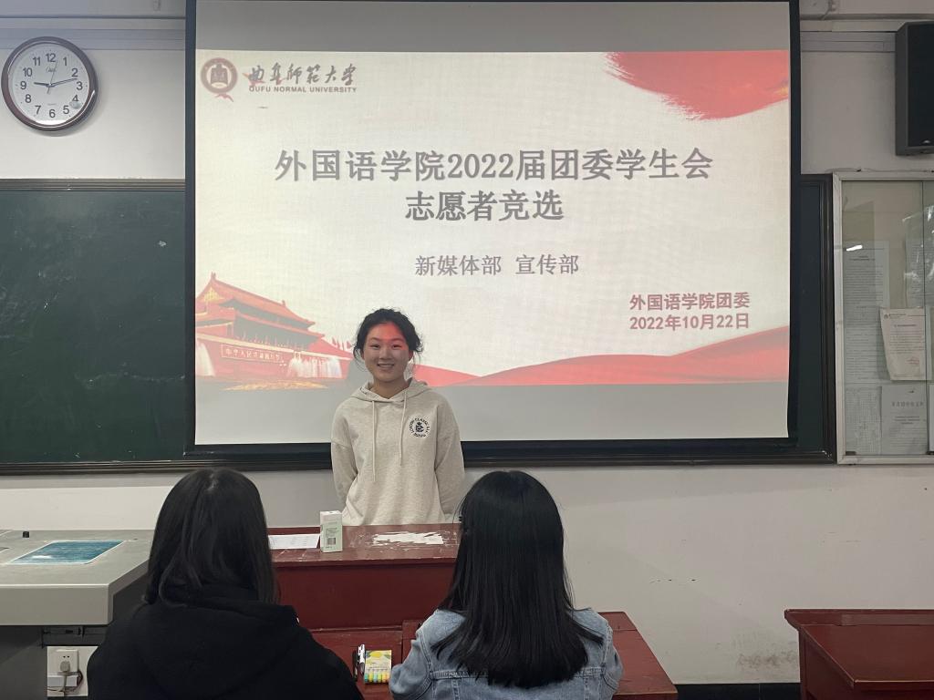 于10月22日开展2022届团委、学生会纳新工作。本次纳新工作由主席团及主要学生干部担任评委,2022级新生积极参与竞选。