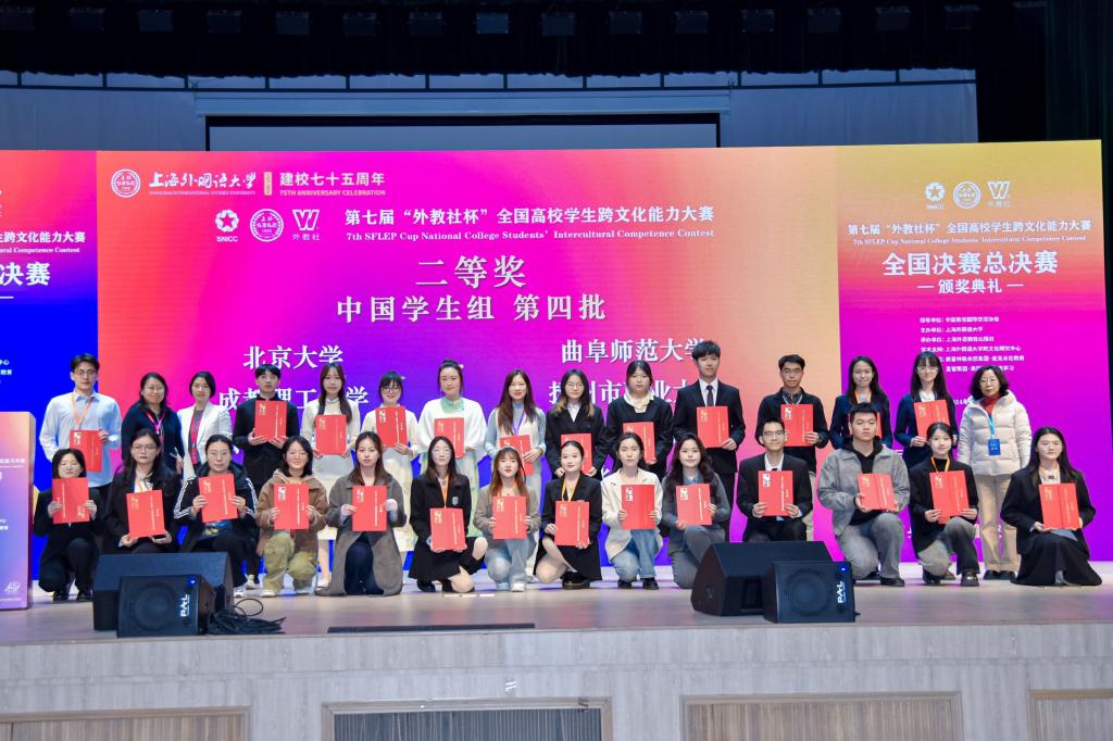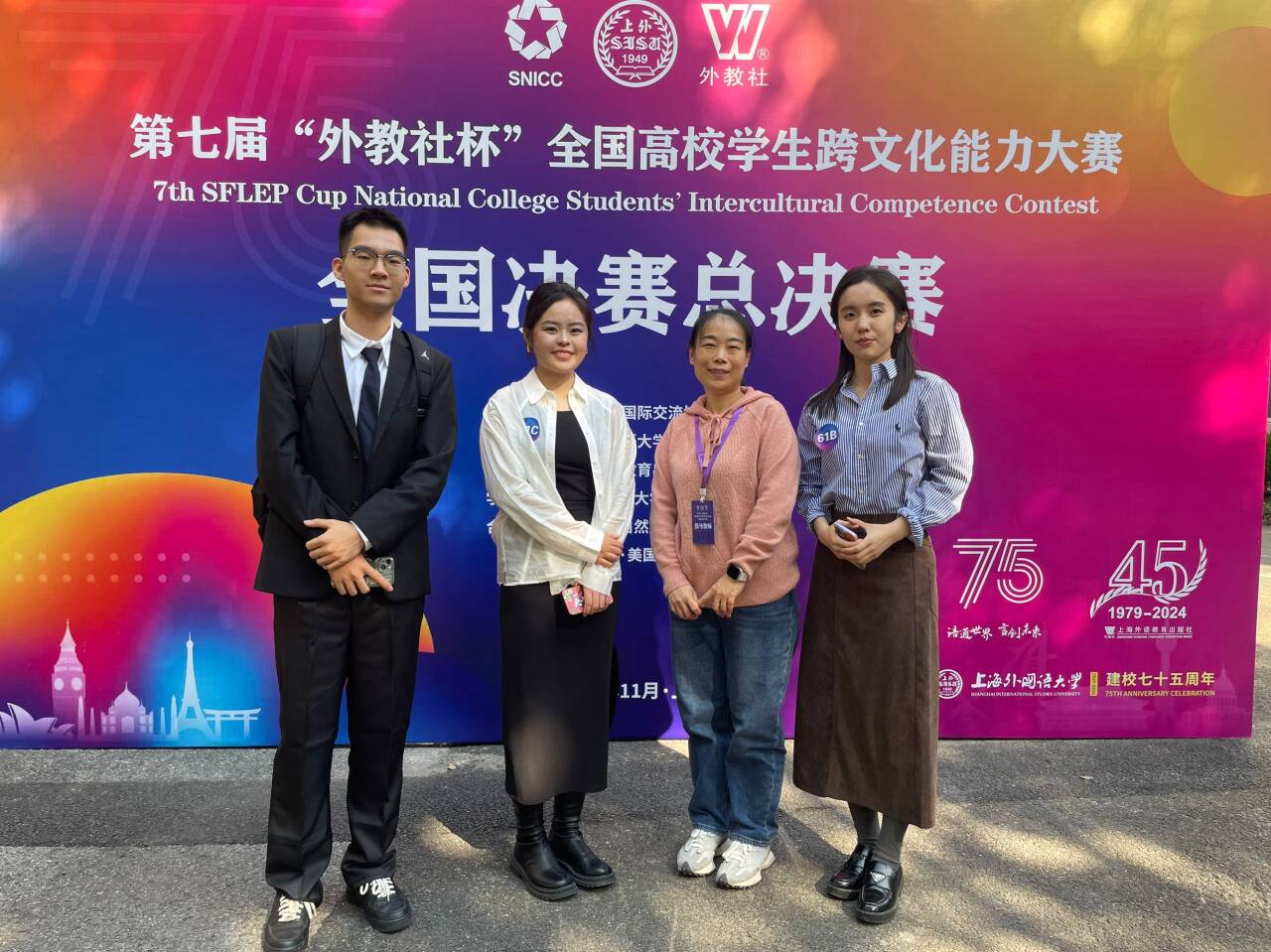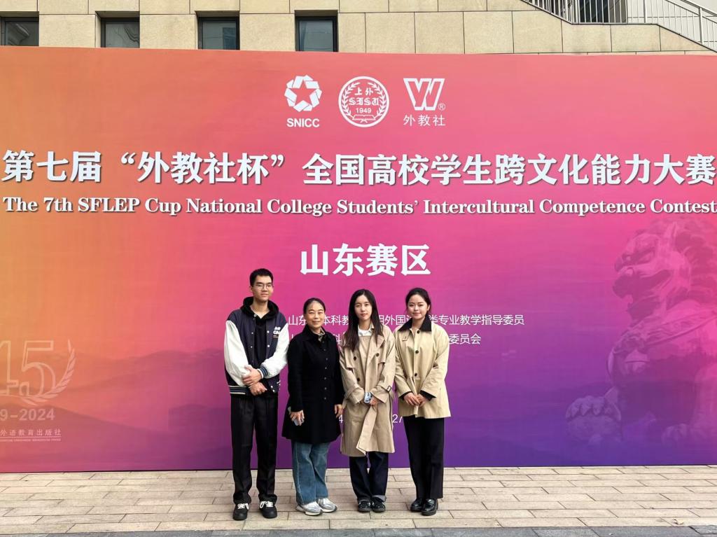 第七届“外教社杯”全国高校学生跨文化能力大赛山东省赛于2024年10月25-27日在青岛大学举办,国赛于2024年11月29日于上海外国语大学(虹口校区)举办。我院学子杨浩然与统计学院巩亦含、崔又心组成团队,共同参加比赛。