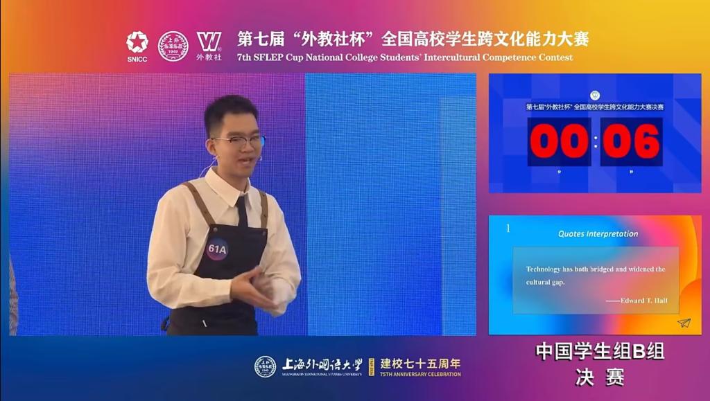 经过初赛的角逐,团队以总成绩前十名的成绩进入27日的山东省决赛。省决赛分为三个环节:知识问答、案例分析、即兴演讲,队内三位同学需合理分工。我院学子杨浩然负责,讲述中国故事(即兴演讲环节),团队以综合成绩前三名的成绩进入全国决赛。国赛共有全国64支代表队参赛,分为三个环节:跨文化案例展析、评委问答、名言名句解读。杨浩然负责名言名句解读环节,抽到的题目问 “Technology has both bridged and widened the cultural gap”经过20s的思考后,杨浩然围绕bridged和widened两方面解读,最后结合习总书记的文化思想升华主题 。最终爱爱网