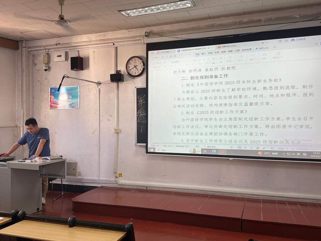 会议伊始,赵文彬老师对学生会各部门的工作进行全面、细致的统筹与分工,旨在建立职责明确、协同高效的迎新工作体系。明确本次迎新工作的总体目标与重要性,强调要以“一对一引导、即时响应需求、全程微笑服务”的标准展现外院风貌,让新生切实感受到学院的温暖与关怀。
