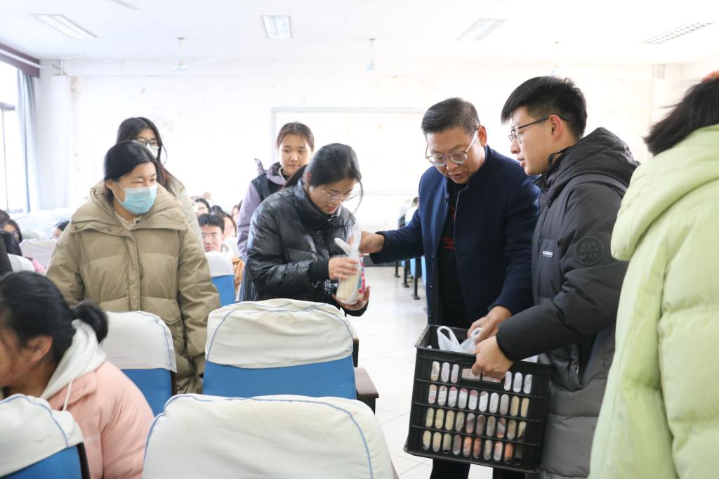 活动伊始,老师与学子们深入交流,话语里既有对备考节奏的贴心叮嘱,也藏着对同学们稳扎稳打、坚持到底的殷切鼓励。随后,老师们将礼包逐一送到每位学子手中——苹果寓意“平安应考”,愿大家带着从容心态顺利赴考、稳操胜券;橙子寄托“学业‘橙’功”,盼同学们不负日夜努力得偿所愿、成功上岸。备考学子们眼神中透着对这场备考“硬仗”的坚定期待。现场氛围温馨,笑声与交谈声交织,缓解了备考的紧张感,也为考研学子增添了暖意。