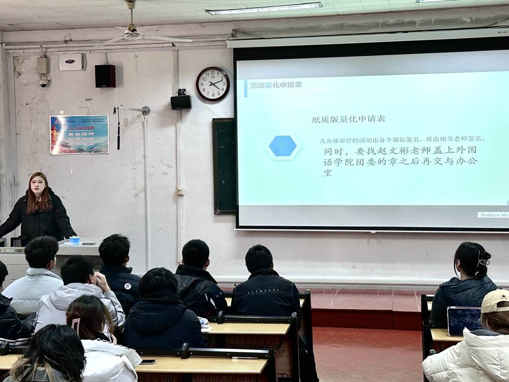 团委办公室副部长于媛向各位学生会成员讲解了学生会报销的具体流程、发票类别及注意事项。随后,团委办公室副部长王梓扬又强调了关于活动量化申请表的注意事项。接着,团委宣传部副部长林佳诺分享了新闻撰写、策划案撰写、红头文件撰写、常见错误四项内容。大会最后,团委网络技术部副部长张立鑫现场展示了Ps软件和Au软件的操作方法,为其他学生会成员编辑图片、处理音频提供了便利。