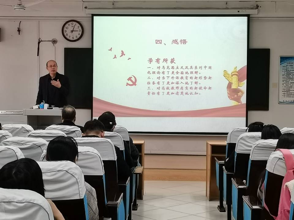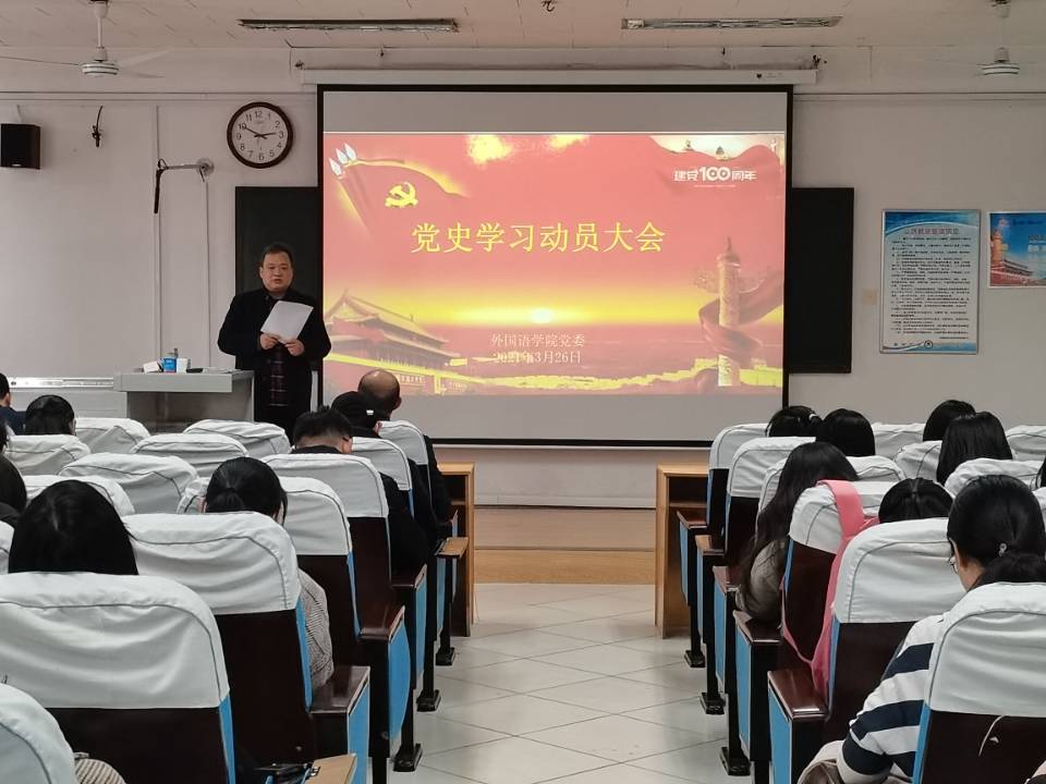 委员会关于党史学习的工作方案》,外学院党委委员、副院长王洪明同志结合自身党校学习经验,分别从研学、反思、实践及感悟四个方面阐述了学习中国共产党历史的必要性和重要性,并对全体党员们提出了重视实践的要求。