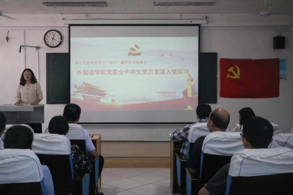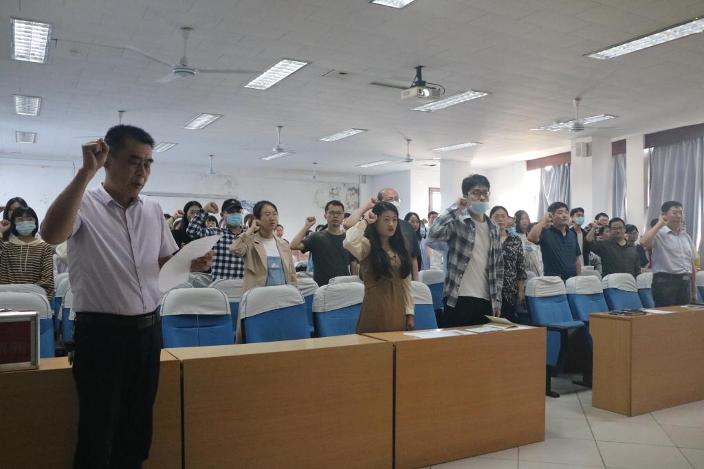 “我志愿加入中国共产党,拥护党的纲领,遵守党的章程.......为共产主义事业奋斗终生,随时准备为党和人民牺牲一切,永不叛党!”在学院党委书记费沂涛的领誓下,我院全体师生党员面向党旗严肃认真,郑重地举起右拳,铿锵有力地庄严宣誓。