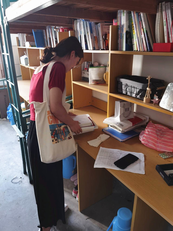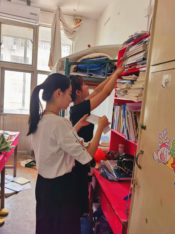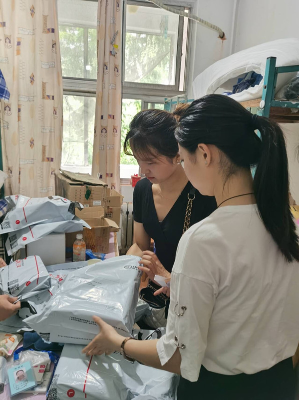 2016级返校毕业生志愿者在辅导员张晓老师的带领下,深入学生宿舍,帮助2019级学弟学妹们寄送急需物品。