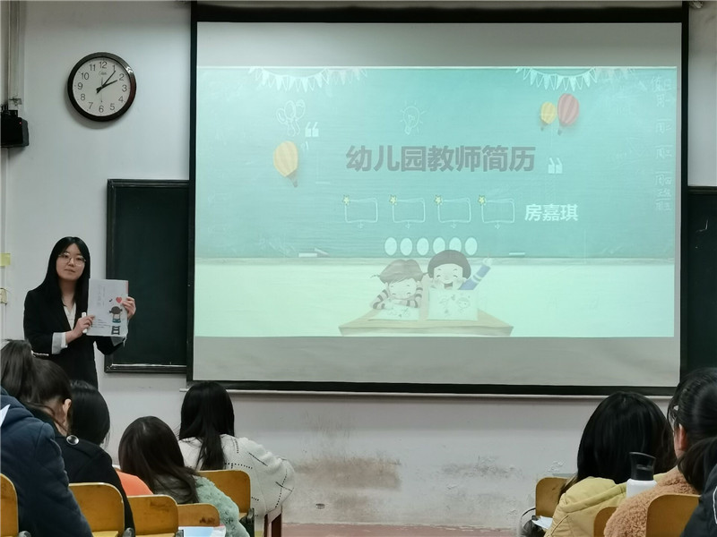 伴随着选手和观众的热烈掌声,比赛正式拉开帷幕。选手们依次进行特长展示(视频)、简历讲解和模拟面试来展示自己的个性与能力,同时表达出自己准确的职业定位和岗位认知。在比赛中,选手们的应聘职位多样,他们基于自己的能力和实践经历进行自我介绍,谈吐清晰,自信昂扬。其中选手张梦帆多才多艺,简历设计实用合理,模拟面试时自信从容,语言表达流畅,表现优异,获得一等奖。最后,评委从简历设计、仪容仪表、现场答辩等方面给予精彩的点评。