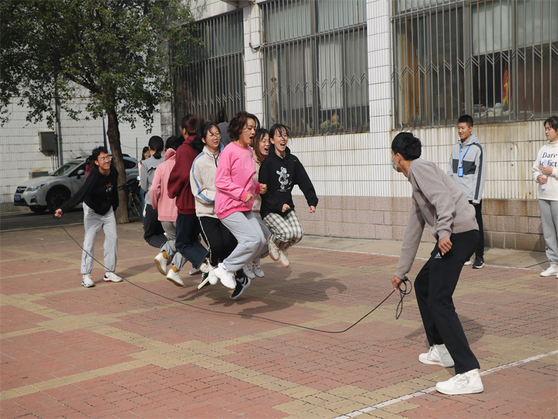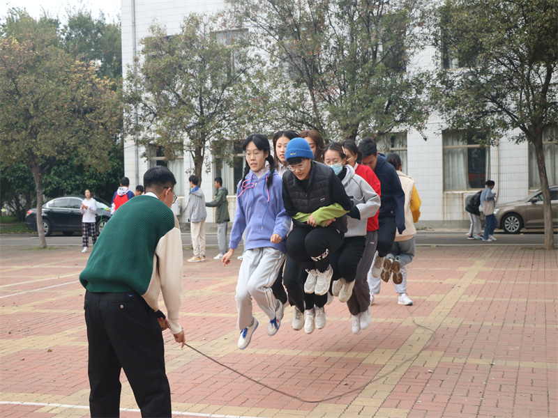于系楼前举办了2021年班级跳绳比赛,辅导员赵文彬、张晓、王伟到场助威,我院学子积极参与。