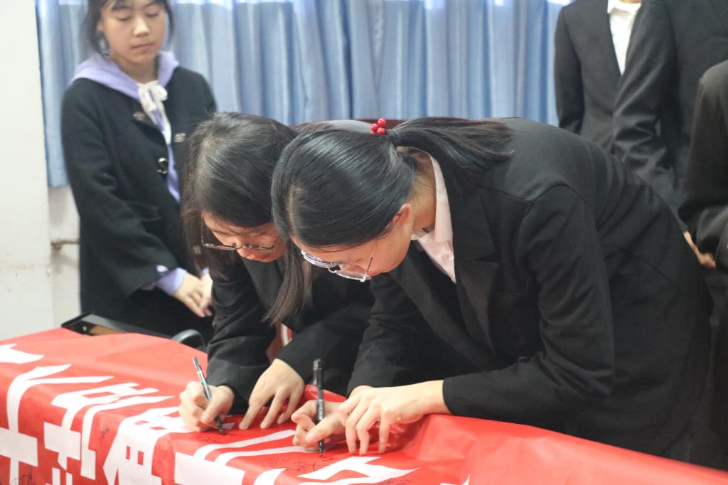 会议伊始,团委老师张晓对团学干部的工作给予了肯定,提到他们在开展文体活动、加强学生行为规范、促进学院精神文明等方面的重要作用,同时指出团学干部在工作方面存在的诸多问题,并对团学干部提出了提高思想品德素质、科学文化素质等五个要求。随后,学院团委副书记李文婷代表全体团学干部承诺坚持从同学中来,到同学中去,做一名服务同学、协助老师的优秀团学干部。紧接着,全体团学干部依次在横幅上写下自己的名字,表明自己作为团学干部为同学服务的决心。最后,团委老师张晓与全体团学干部合影留念。