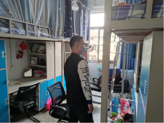 领导老师走进学生宿舍,仔细查看宿舍卫生以及相关设施情况,并和同学们进行了友好交流,亲切询问同学们的日常生活状况,让同学们在开学之际深深感受到了来自老师的关怀和照顾。在检查过程中,仍发现有安全隐患存在,针对隐患,党委副书记王作茂强调,用电安全要时刻注意,我们要做到防患于未然;如今正值春季,春天是各种流行性传染病的高发期,疫情态势也在蔓延,同学们一定要注意保持宿舍卫生,及时通风,做好疫情防控,遇到问题及时与老师沟通,共同营造健康安全的宿舍生活环境。