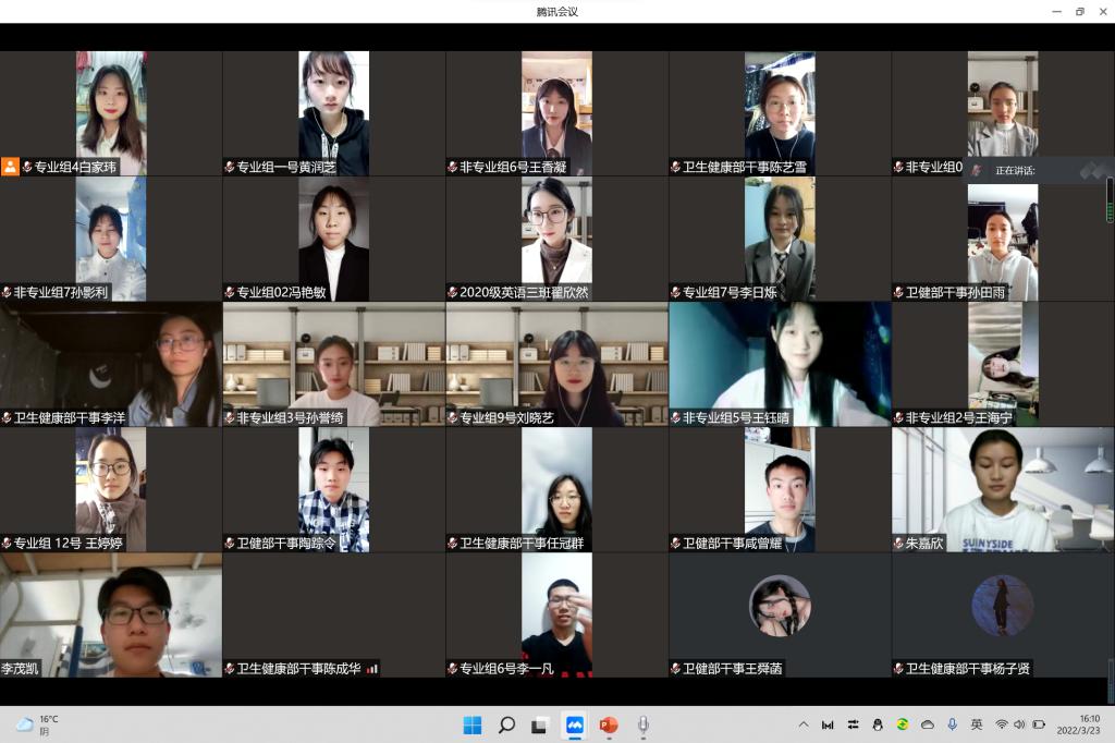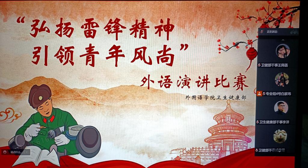 举办了“弘扬雷锋精神,引领青年风尚”英语演讲比赛。鉴于疫情防控形势,本次比赛以线上方式进行。学院孔艳艳老师、辅导员王伟、王仁杰出席本次线上比赛并担任评委。