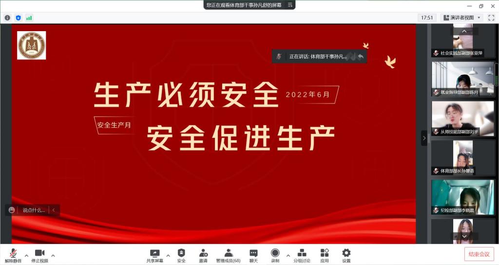 体育部于腾讯会议开展了安全知识技能培训,体育部干事孙凡舒为同学们普及了有关“安全生产月”的知识。6月7日至6月20日,爱爱网