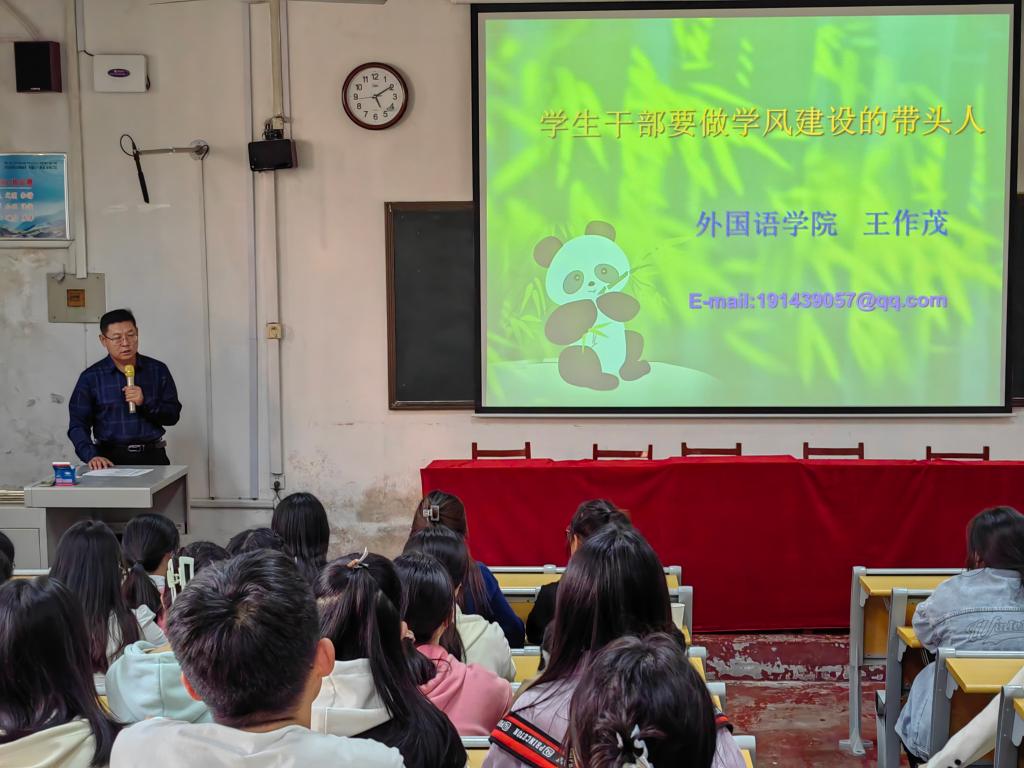 团委、学生会成立大会和学生干部能力素质开班仪式两部分内容。会议伊始,赵文彬老师公布了2023届主席团及部长的选举结果,对成功选举的学生干部表示衷心的祝贺。紧接着,王作茂副书记致辞,对学生干部们提出要求,寄予厚望。张晓老师介绍各学生会部门的分管老师,以此方便学生干部和老师之间的交流沟通,促进学生工作的顺利进行。随后,王作茂书记对2023届全体学生干部进行能力素质的培训。王作茂书记首先对学生干部提出要做“学风建设的带头人”的希望,分别从基本要求、学风建设、学生干部的带头作用及学习适应四个方面对学生干部进行培训,希望学生干部严格要求自己,提升自己的活动组织能力、团队协作能力和沟通交流能力。他强调,学生干部要坚持“一个中心,两个目标,三个习惯,四个无,八项教育,九种能力”的工作思路,激励学生干部们以“滴水不成海,独木不成林”的精神团结同学,致力于成为学生群体的榜样和先锋。