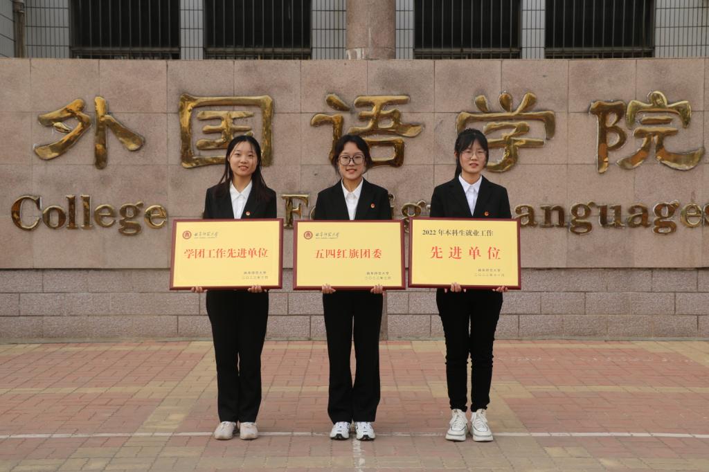 获2022年度“学团工作先进单位”、“五四红旗团委”、“本科生就业工作先进单位”荣誉称号,学院团委副书记张晓获2022年辅导员年度人物。