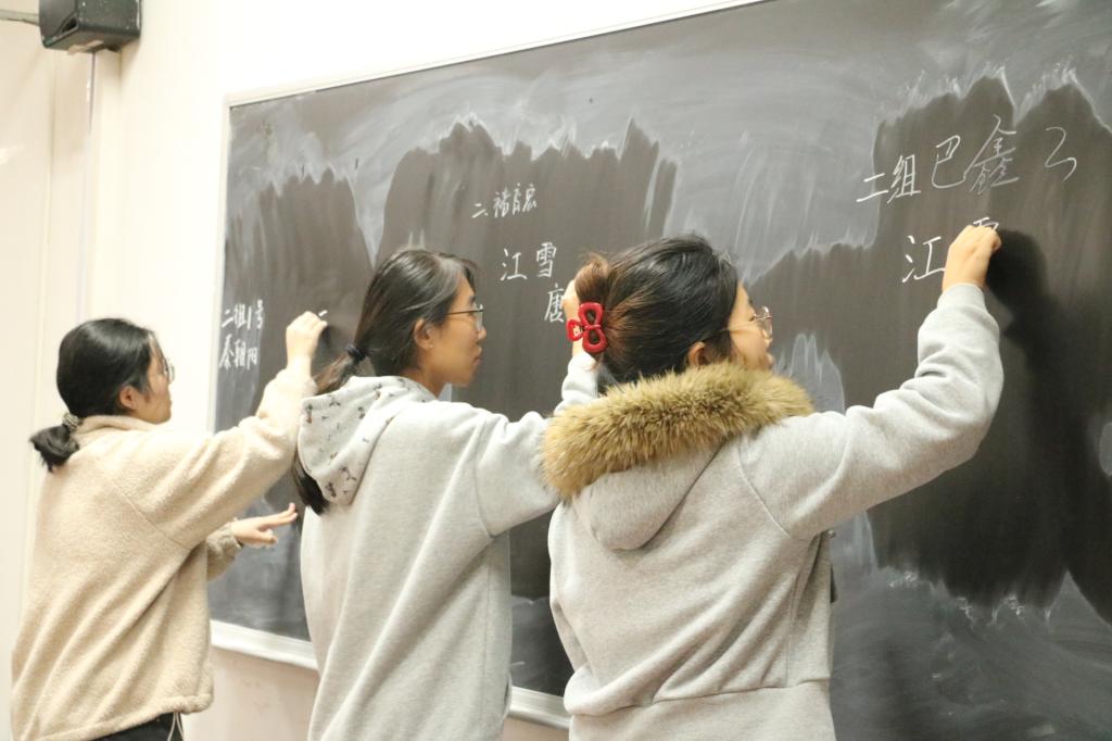 本次粉笔字大赛分为初赛、决赛两个阶段,设师范生、非师范生两个组别,面向大二、大三年级全体同学展开。初赛阶段,学生需以《江雪》为书写内容,每班推选两人进入决赛,晋级选手在决赛阶段则需限时书写《江雪》。比赛现场,选手们手中握笔,神情专注,笔画遒劲有力。选手们的字体端庄秀丽,书写风格多样,或清秀灵动,或富含创意。评委在“笔画标准”这一评判准则的基础上新增“字体与诗意适配度”“板书布局美感”等指标进行打分。最终,秦朝阳、王贞茹同学凭借兼具规范性与艺术性的板书荣获师范组一等奖,卢思宇同学以富有个人风格的书写荣获非师范组一等奖。