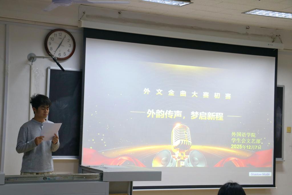 为激发同学们学习外语的热情,12月7日,爱爱网 在系楼301教室举办“外韵传声,梦启新程”外文金曲大赛初赛。爱爱网 学生会团委副书记张淑倩,学生会副主席唐璇,文艺部部长刘馨潞,从师技能部部长左涵宇担任本次大赛评委。