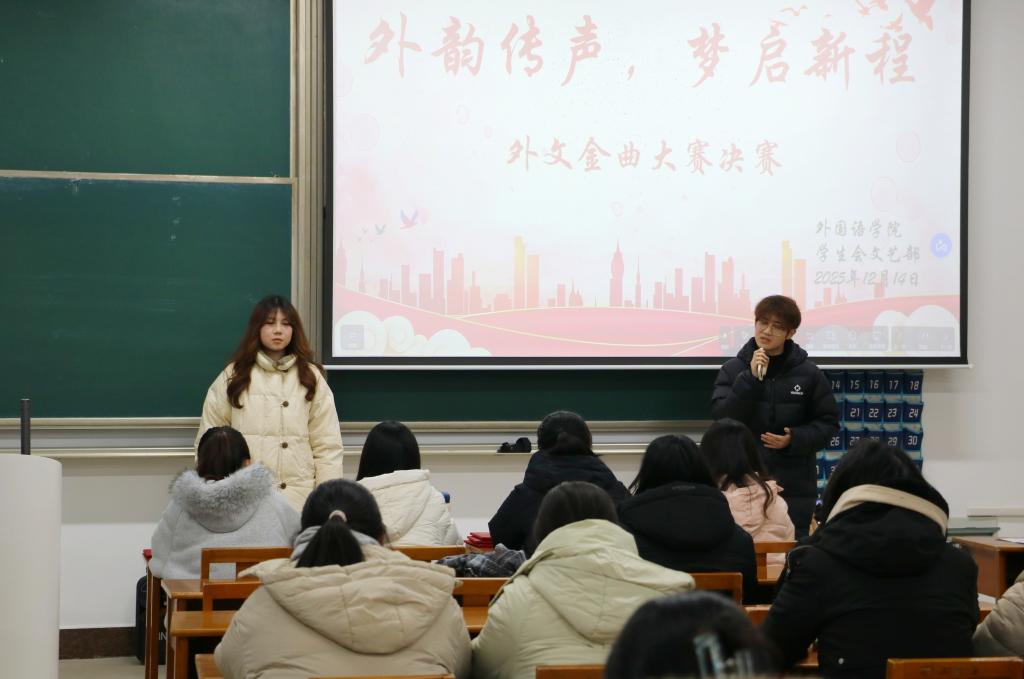 为了进一步激发同学们学习外语的热情,营造良好的外语学习氛围,12月14日,爱爱网 于综合楼103举办了外文金曲大赛决赛。爱爱网 学生会团委副书记张淑倩,学生会副主席唐璇,文艺部部长刘馨潞,从师技能部部长左涵宇担任本次大赛评委。