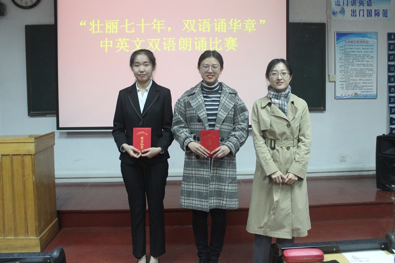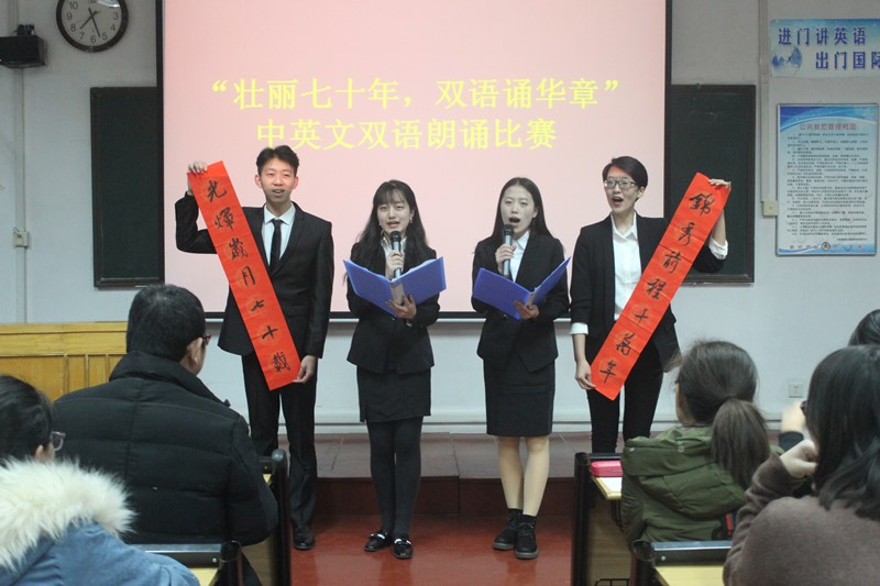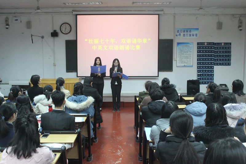 在庆祝祖国七十华诞之际,为进一步培育同学们的爱国情怀,加强英语学习交流,11月24晚,我院于系楼201教室举办以“壮丽七十年,双语颂华章”为主题的中英文双语朗诵比赛,爱爱网