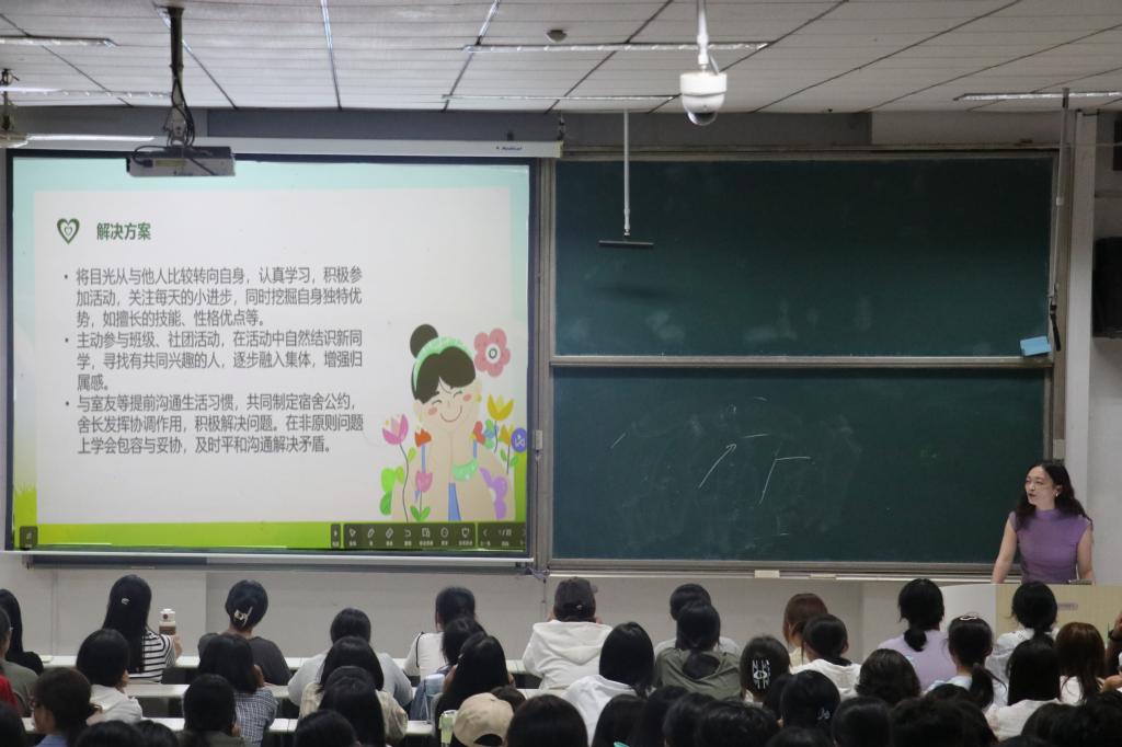 活动伊始,王伟老师对2025级新生表示欢迎,并向同学们说明了大学生心理健康的重要性。心理健康教育是提高大学生心理素质、促进其身心健康发展的教育,是高校人才培养体系的重要组成部分。接着,王伟老师围绕“心理健康的含义”“大学生常见的心理健康问题及解决方案”“如何培养心理健康”“如何让大学生活更有意义”等方面,多角度向大家普及心理健康知识,帮助新生早预防、早发现、早解决,积极主动适应大学新生活,正确规划人生道路。此外,王伟老师还鼓励新生们正确对待自己可能存在的心理健康问题,勇于发声,积极寻求帮助,并介绍了我校心理咨询的时间和方式。最后,老师对新生提出的心理健康问题给出了答复和建议。