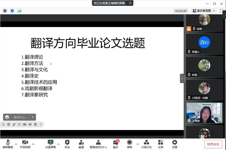 随后,张立昌老师就英语教育教学与语言学、林瑛老师就文学、王海霞老师就翻译方向进行具体选题指导。本次会议为保证2019级学生精准选题提供了机会,希望通过本次会议,2019级全体同学能够为毕业论文撰写工作争取一个良好开端。