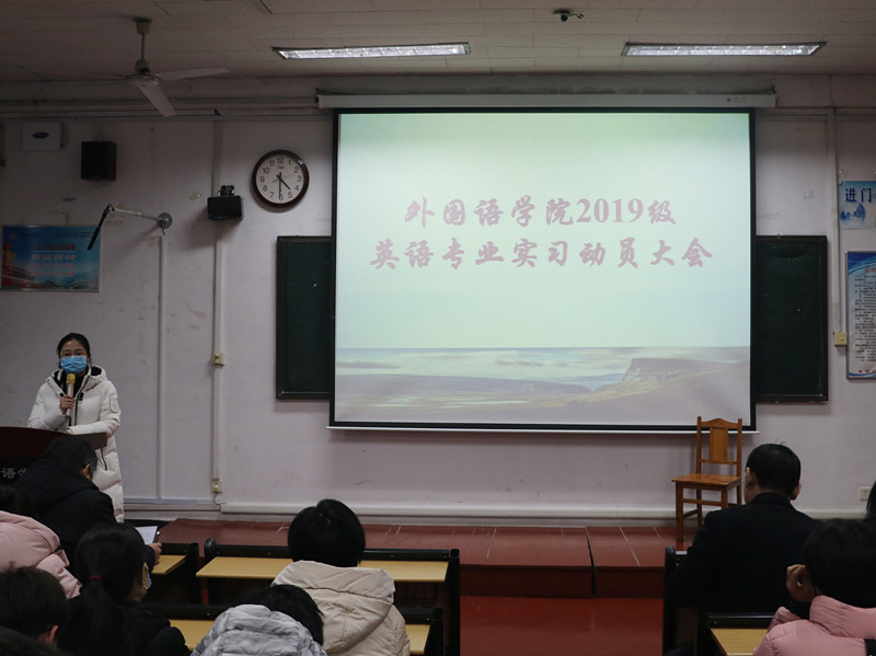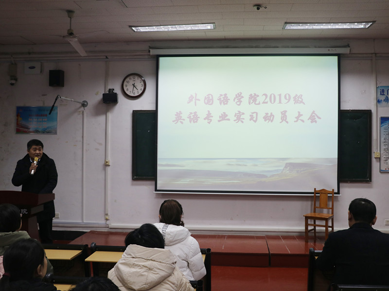 于系楼201室召开2019级英语专业实习动员大会。此次会议由我院2019级辅导员张晓主持,党委副书记王作茂、副院长邢加新、英语系主任徐欣以及各支教实习指导老师出席大会,2019级英语专业全体学生参加。