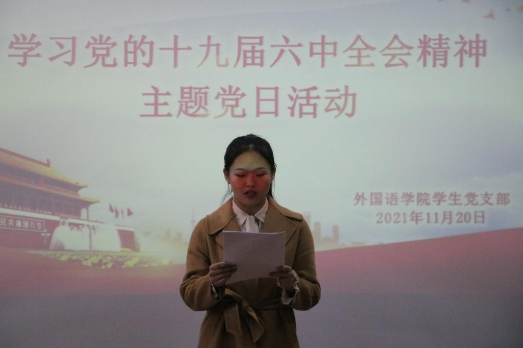 会上,全体党员学习党的十九届六中全会公报,王嘉艺同志带领全体参会人员通过一组组数字,学习了党的十九届六中全会的内容。之后,法国留学生预备党员代表借助视频会议分享党的十九届六中全会精神的学习心得,她表示,自己虽身处异国但牢记党员身份,深入学习贯彻党的各项方针政策。她的发言得到全体参会者的鼓励。随后,与会成员一一分享关于学习党的十九届六中全会精神的心得感悟。最后,张晓同志总结到,全体同志在今后的学习工作生活中,要深入学习党的十九届六中全会精神,并以此为契机,学习党的先进理论知识,武装头脑,立足自己岗位,发光发热,为实现第二个百年奋斗目标贡献自己力量。