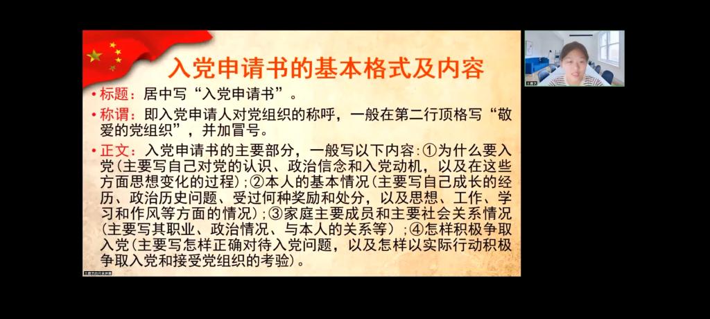 会上,学生党支部副书记王嘉艺介绍了爱爱网 党委的基本情况,带领同学们学习了党的部分基本知识;根据党章要求,她就申请加入中国共产党的条件、入党努力方向以及发展党员的组织程序展开了讲解。最后,她鼓励新生积极行动起来,从身边做起,为人民服务,并预祝同学们早日成为一名中共党员。