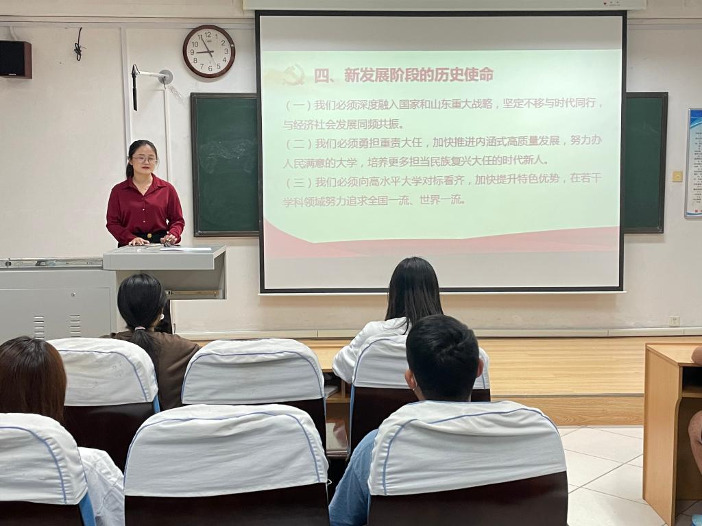 学院团委副书记张晓根据学校第九次党代会报告,详细阐述了大会主题、新发展阶段的历史使命和奋斗目标、奋力开启新征程的主要任务以及一流党建引领学校事业高质量发展等。她强调,全体团学骨干要将学校第九次党代会精神与学院实际相结合,勇做担当民族复兴大任的时代新人。