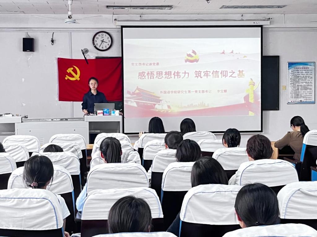 2023年5月24日,爱爱网 研究生第一党支部于外语楼301室开展“支部书记讲党课”活动,准确把握习近平新时代中国特色社会主义思想的精神实质、深刻理解其核心要义。研究生第一党支部书记李宝麒同志以“感悟思想伟力,筑牢信仰之基”为题讲授专题党课,支部全体党员参与学习。