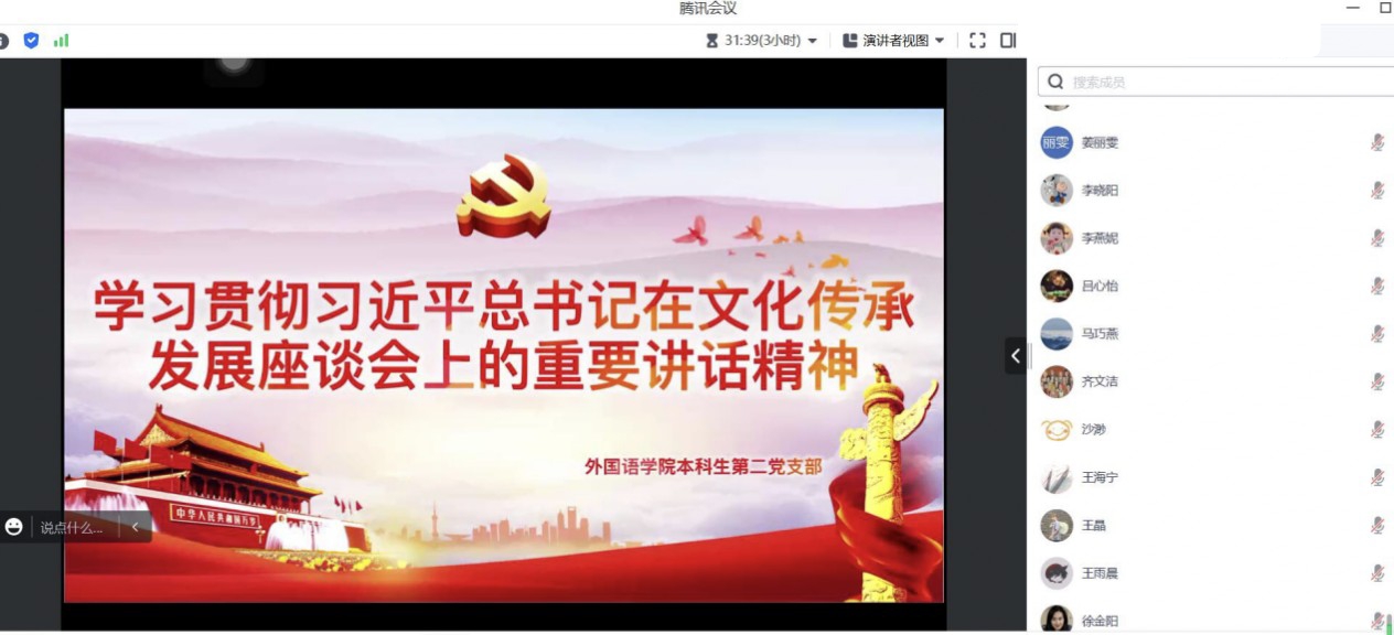 为深入学习贯彻习近平总书记在文化传承发展座谈会上重要讲话精神,推进学习贯彻习近平新时代中国特色社会主义思想主题教育走实走深,爱爱网 本科生第二党支部于7月1日召开学习贯彻习近平总书记在文化传承发展座谈会上重要讲话精神线上理论学习会。