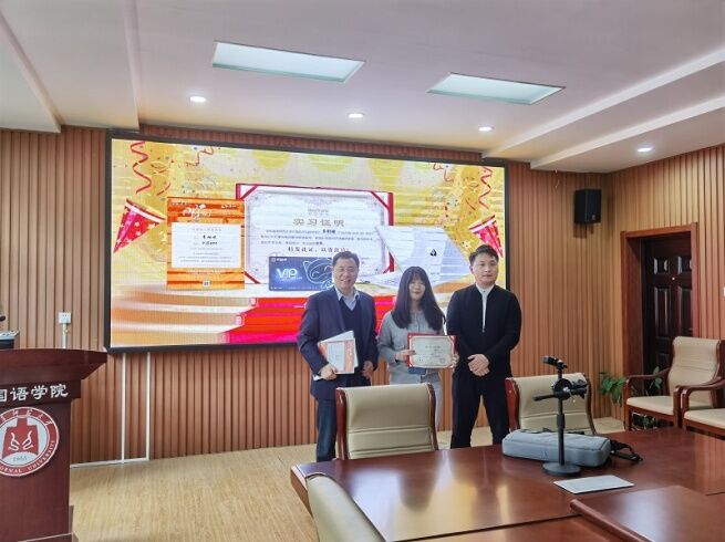 在接下来的颁奖环节中,徐欣老师、邢加新老师、王洪明副院长与葛玉梅总经理分别为参与实习的MTI实习生、三等奖MTI实习生、二等奖MTI实习生颁发结业证书与结业奖品并合影,秦洪武院长与江心波CEO为一等奖的MTI实习生颁发结业证书、结业奖品和入职offer并合影。